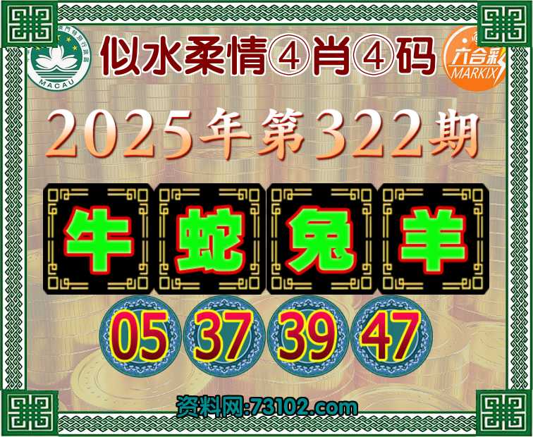322期:〖似水柔情〗 👈④肖④码👈【牛蛇兔羊】【05.37.39.47】开:羊47准彩民验证